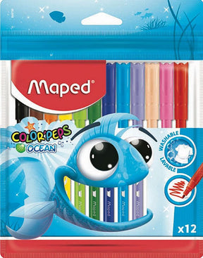 Представяме ви комплект флумастери Maped Color Peps, в който са включени 12 различни цвята. Подходящи за рисуване и оцветяване, те са чудесна възможност, с която вашето дете може да развихри своето въображение. Флумастерите са с дълготрайно мастило и лесно се поместват в ученическата чанта. Блок система на пишещия връх. Дебелината на линията, която оставят е 2.0 mm.